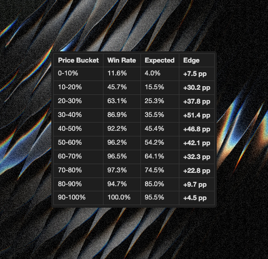 Our win rate analysis by price bucket reveals systematic patterns: