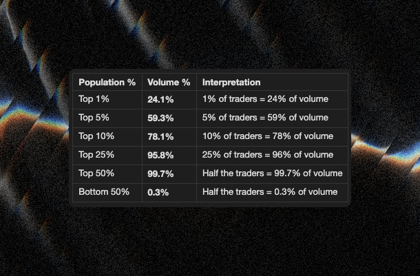 The bottom half of all traders combined account for 0.3% of total volume.